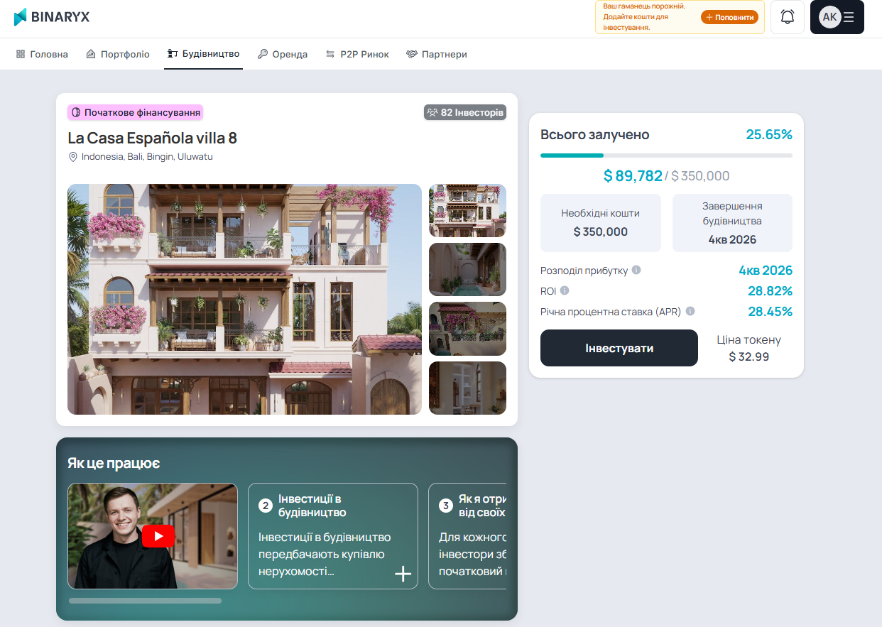 Така нерухомість пропонується на сторінці [«Будівництво».](https://app.binaryx.com/uk/construction)