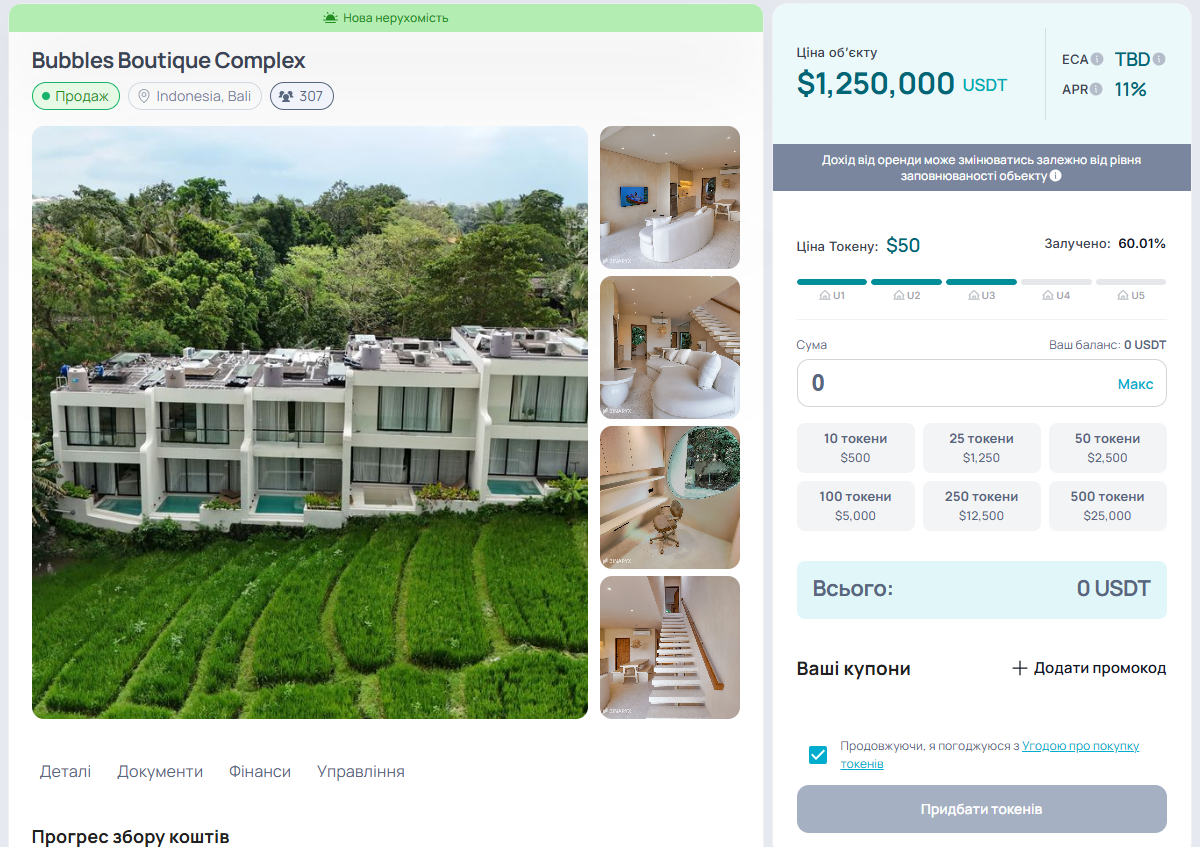 ⚠️ Зверніть увагу, що для забезпечення прозорості та справедливості один інвестор може володіти не більше ніж 25% всіх токенів для будь-якої нерухомості. Наприклад, якщо нерухомість токенізована в 10 000 токенів, один інвестор може володіти не більше ніж 2500 токенами.