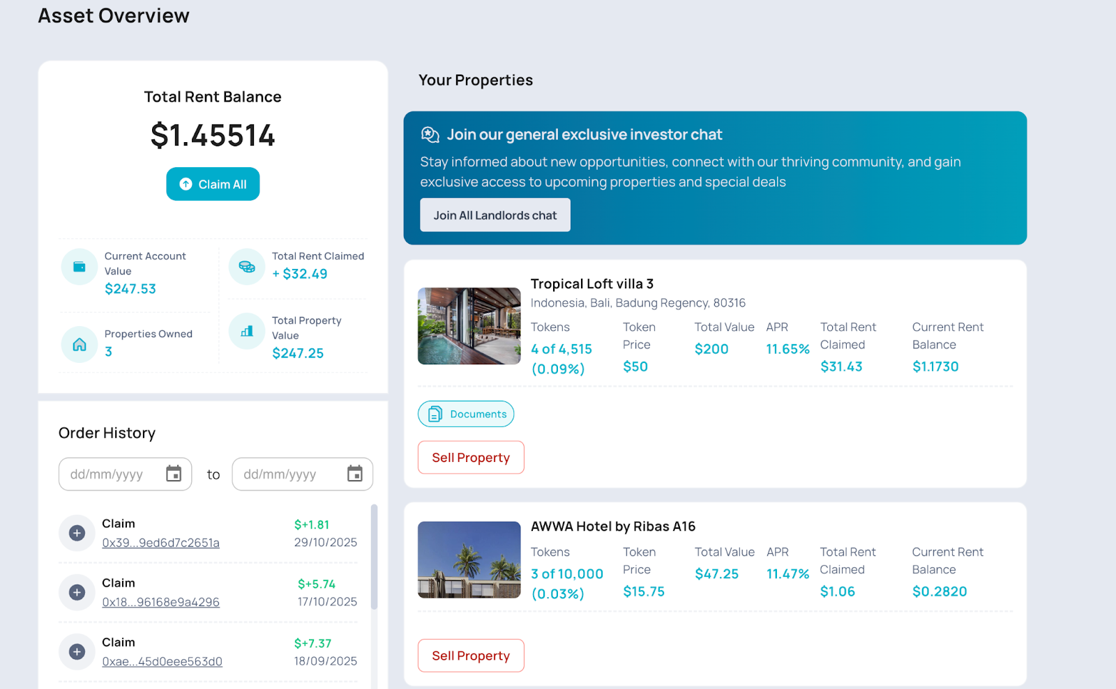 Вітаємо! Тепер ви офіційний співвласник орендованої вілли, і з цього моменту ви починаєте отримувати реальний дохід від оренди, як у блокчейні, так і в реальному світі.